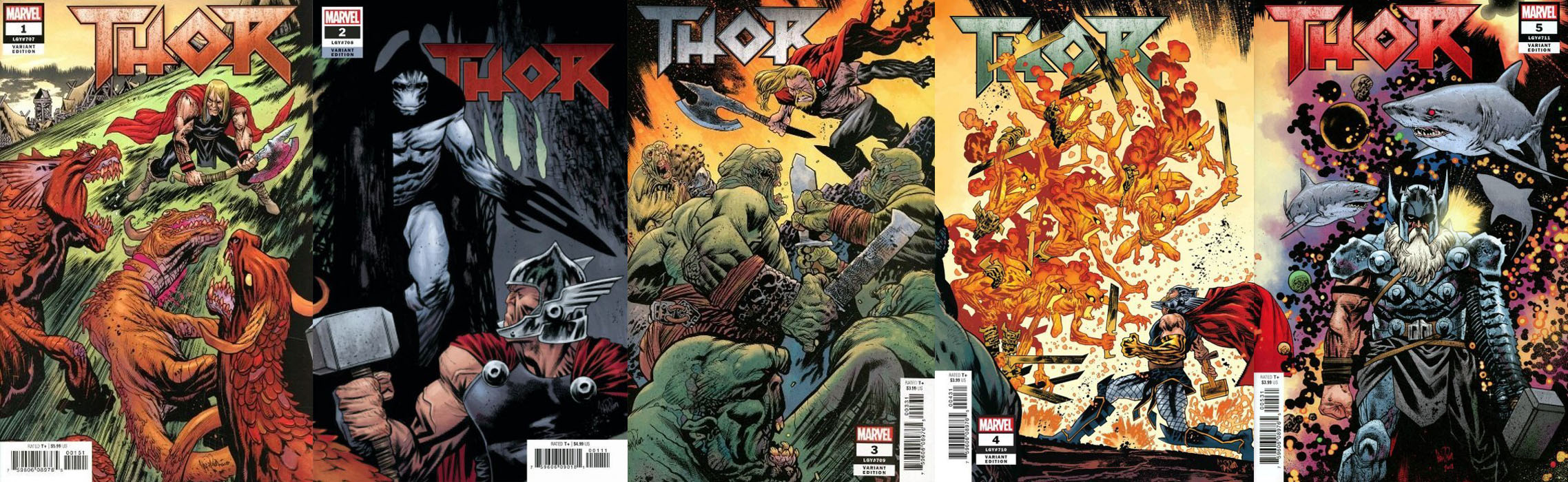 - La portada alternativa de James Harren y Dave Stewart forma una ilustración con las portadas alternativas de Thor vol.3 #1-Thor vol.3 #3 y Thor vol.3 #5 de los mismos autores.