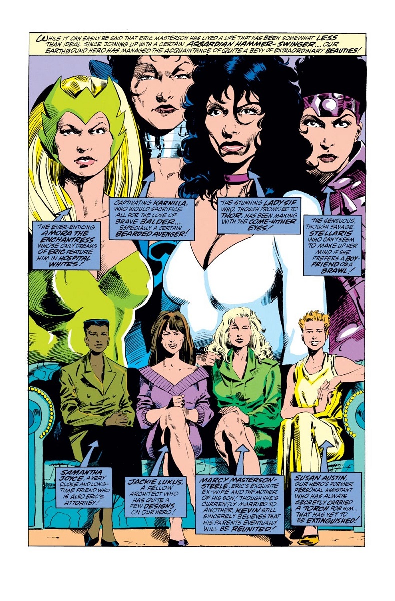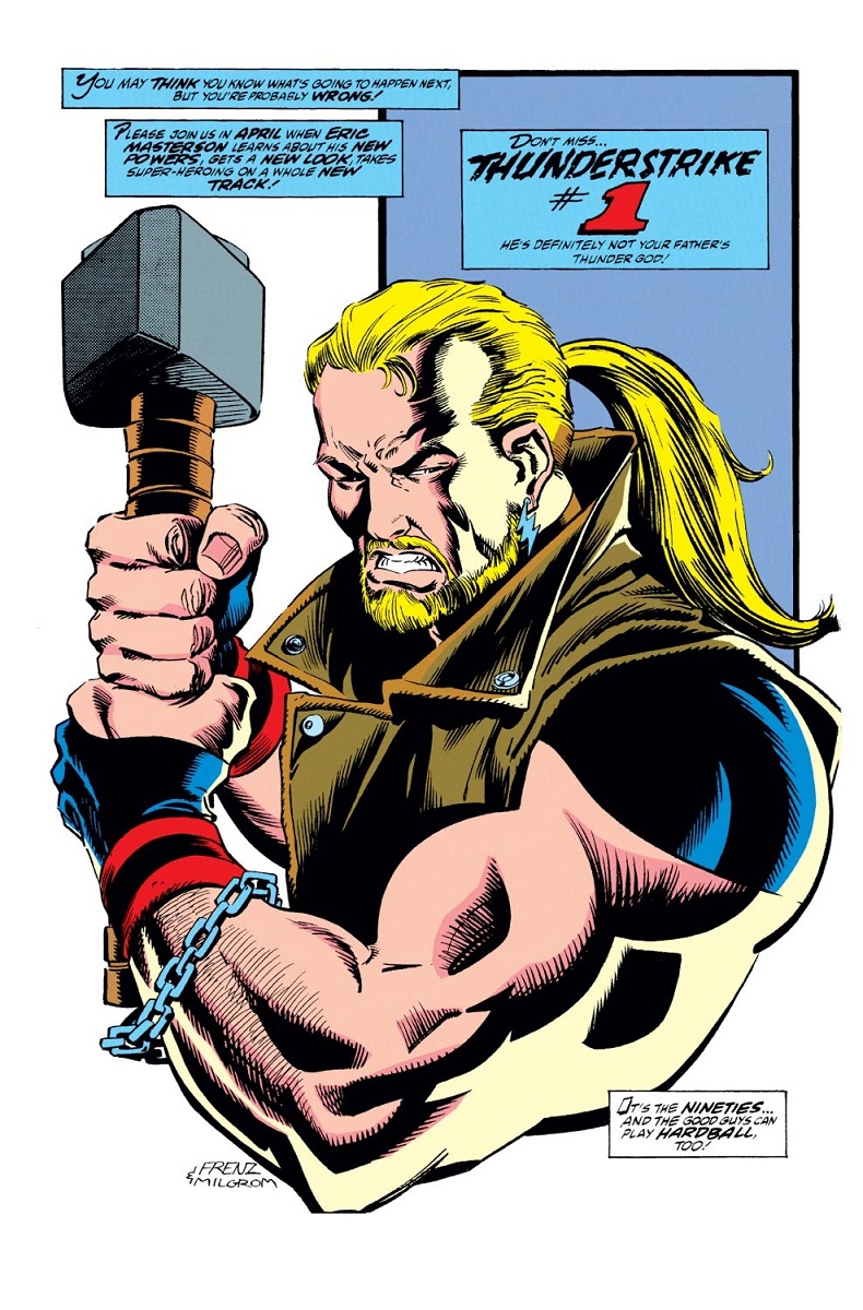 Thor y Eric Masterson se pelean por Sif y el Mjolnir. Luchan por todo Asgard, y aunque Odín sabe que Amora está detrás del hechizo de Eric, lo consiente, pues tiene otros planes. Al invocar un rayo al unísono, ambos son derribados, y Eric recupera el sentido. Renuncia al Mjolnir y se prepara para partir, despidiéndose de una Sif entre lágrimas. Thor lo lleva de vuelta a la Tierra y le da un regalo de Odín: un bastón. Thor regresa a Asgard, y Eric, al notar que el bastón le resulta familiar, lo golpea contra el suelo. Lo transforma de nuevo en Thor, pero el bastón se ha transformado en una maza que le da el poder de Thunderstrike.