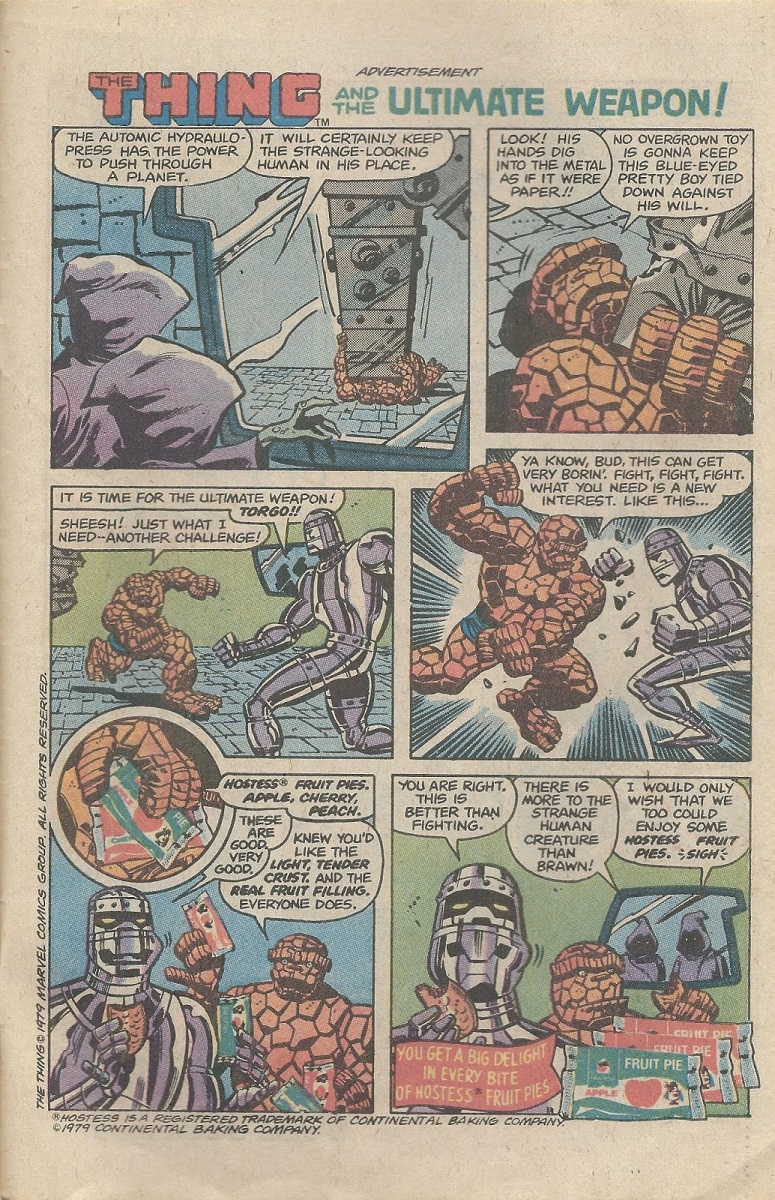 - Entre los diferentes contenidos publicitarios se incluye "The Thing and the Ultimate Weapon!", con la particularidad de que es un cómic protagonizado por la Cosa, que publicita unos pastelitos, de autores desconocidos. Se cree que podría ser obra de Sal Buscema y Al Milgrom, con rotulación de Irv Watanabe, aunque no es un dato contrastado (1 página).