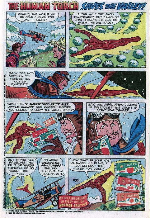 - Entre los distintos contenidos publicitarios se incluye "The Human Torch Saves the Valley!", con la particularidad de que es un cómic protagonizado por la Antorcha Humana, promocionando unos pastelitos, realizado por autores desconocidos (1 página).